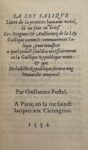 POSTEL (Guillaume) — La Loy salique : livret de la première humaine vérité, là où sont en brief les origines & auctoritez de la loy gallique nommée communément salique.