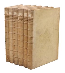 Superbe exemplaire, d'une grande fraîcheur, relié en vélin estampé de l'époque. Les six volumes ont été établis individuellement et non deux par deux, comme c'est généralement le cas.