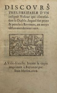 [CANARD] — Discours très-véritable d'un insigné voleur qui contrefaisoit le Diable, lequel fut prins et pendu à Bayonne, au moys de janvier dernier 1608.