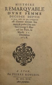 [CANARD] — Histoire remarquable d’une femme décédée depuis cinq ans en ça, laquelle est revenuë trouver son mary, et parler à luy aux fauxbourgs S. Marcel lez Paris, le Mardy 11 décembre 1618.