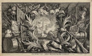 Ces vignettes rectangulaires (env. 85 x 135 mm), d'une remarquable finesse, représentent les attributs et actions militaires des compagnies françaises de mousquetaires, gendarmes, chevau-légers, grenadiers à cheval, gardes français et suisses, durant les batailles de Louis XIV et des règnes précédents. L'Inventaire du fonds français ne décrit que 34 pièces (IV, 267, nos 136-169).