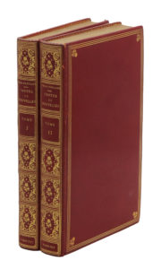1777. 2 volumes in-8, maroquin rouge, triple filet doré et fleurons aux angles, dos lisse orné, dentelle intérieure, tranches dorées, étui collectif (Ch. de Samblanx, 1921).Charmante illustration légère, composée de 83 planches gravées en taille-douce, dont deux frontispices par Vidal, un portrait de l'auteur gravé par Macret d’après Fiquet, auxquelles s'ajoutent 2 vignettes de titre et 43 culs-de-lampe.