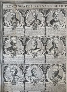 Les huit premières forment un grand tableau gravé (environ 160 x 115 cm monté), comprenant 72 portraits gravés avec de courtes notices biographiques, de Frère Gérard en 1099 à Emmanuel de Rohan-Polduc en 1797. Quant aux deux dernières feuilles, elles comprennent neuf portraits, jusqu'à G. B. Ceschi a Santa Croce, et neuf médaillons vides.