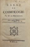 C'est dans l'Essai de cosmologie que Maupertuis présente le principe de moindre action. L'édition originale, publiée l'année précédente à Berlin, n'avait été tirée qu'à 100 exemplaires et demeure, de ce fait, extrêmement rare.