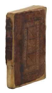Exemplaire dans sa première reliure en vélin du temps, sur laquelle on a contrecollé les plats et une portion du dos d'une curieuse reliure du XVIe siècle en veau brun ornée d'une devise latine.