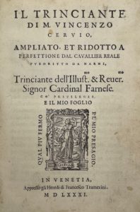 Venise, Héritiers de Francesco Tramezini, 1581. Petit in-4, demi-vélin, dos lisse orné (Reliure vers 1800).Édition originale de ce rare et précieux traité de l'écuyer tranchant, dont les soixante-quatorze chapitres, consacrés à la découpe et la présentation des viandes, volailles, poissons et fruits, constituent une source de première importance sur l'art de la table et la gastronomie de cour dans l'Italie du Cinquecento.