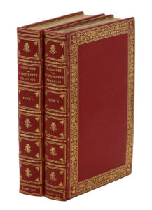 Paris, Conquet, 1897. 2 volumes in-12, maroquin rouge, plats encadrés d’une large dentelle dorée, dos lisse orné, doublure de soie bleue, gardes volantes de la même soie bleue, tranches dorées sur témoins, couvertures et étui (Chambolle-Duru).Édition illustrée de 50 compositions en noir de Durand, gravées à l’eau-forte par E. Champollion.