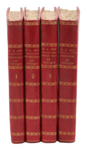 On joint cinq ouvrages du même auteur : Tableau comparé de la conduite qu’ont tenue envers moi les ministres de l’ancien régime avec celle des ministres du nouveau régime. Paris, P. Didot l’aîné, 1814. – Probabilités physiques. Ibid., 1816. – Opuscules historiques et physiques. Ibid., 1816. – Mémoires historiques et physiques. Ibid., 1817. – Formation des monts ignivomes nommés volcans. Ibid., 1817. 5 volumes in-8, brochés, couverture muette de papier blanc, non rognés. Éditions originales de ces cinq opuscules de Balthasar-Georges Sage. Les Mémoires historiques et physiques sont illustrés d’une planche coloriée relative au verre cristallisé. Mouillures et pâles rousseurs éparses.