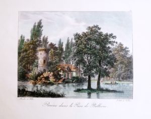 Ruine dans le Parc de Bellevue. 20 x 22 cm. Lithographie en couleurs de Villain, XIXe siècle.