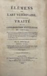 BOURGELAT (Claude). Élémens de l’art vétérinaire. Traité de la conformation extérieure du cheval. Paris, Mme Huzard, 1818. In-8, broché, non rogné. Septième édition, publiée avec des notes par J.-B. Huzard, ainsi qu’un portrait de l’auteur et une grande planche dépliante. Couverture défraîchie, second plat détaché. Mennessier, I, 161.