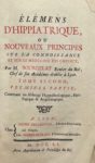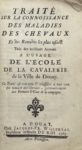 Traité sur la connoissance des maladies des chevaux et des remèdes les plus usités. – Instruction sur différens objets relatifs à la cavalerie. Douai, Willerval, 1766-1767. 2 ouvrages en un volume in-12, broché, couverture de papier marbré. Éditions originales de ces deux manuels à l’usage de l’école royale de cavalerie de Douai, créée par Louis XV en 1763 mais transférée à Saumur dès 1771. « Ces deux opuscules, assez rares, sont quelquefois reliés ensemble », écrit Mennessier. Le premier est un traité d’hippiatrie, dont les dernières pages sont consacrées à l’armement du cavalier ; le second, un cours d’hippologie et de harnachement. Quelques rousseurs et petites mouillures sans gravité. Mennessier, I, 672 et II, 580.