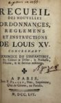 [INFANTERIE] — Recueil des nouvelles ordonnances, règlemens et instructions de Louis XV concernant l'exercice de l'infanterie, les crimes et délits, la noblesse, l'école et le service militaires.