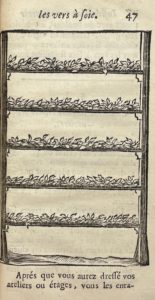 Lyon, Léonard Plaignard, 1695. Petit in-12, veau fauve, dos orné, tranches jaspées (Reliure de l'époque).Très rare édition lyonnaise de cet ouvrage sur la culture des mûriers et des vers à soie. Elle est illustrée de deux figures à pleine page gravées sur bois, montrant « comment il faut dresser les ateliers des vers à soie ».