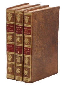 Paris, Delance & Lesueur, 1802. 3 volumes in-8, basane racinée, dos lisse orné, tranches mouchetées (Reliure de l'époque).Édition originale de cette traduction française des cinq livres de l'Histoire naturelle de Pline consacrés à la zoologie.
