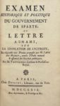 VAUVILLIERS (Jean-François de) — Examen historique et politique du gouvernement de Sparte ; ou Lettre à un ami, sur la législation de Lycurgue.