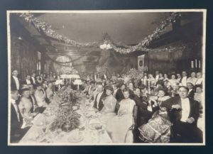Photographie en tirage d'époque noir et blanc (17 x 25 cm) monté sur carton noir marqué du nom du photographe. Vue de la salle à manger d'Arthur J. Caton (1851-1904), à Chicago, lors de la debut party organisée pour Catherine Eddy Beveridge (1881-1970), la nièce de son épouse Delia, en 1901.