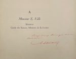 Exemplaire de présent imprimé sur japon pour Ernest Vallé (1845-1920), sénateur de la Marne et garde des Sceaux dans le gouvernement Émile Combes, avec une dédicace imprimée comportant un envoi autographe signé de l'auteur et une chromolithographie supplémentaires.
