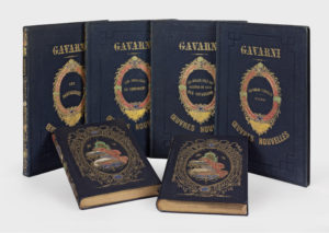 Paris, G. de Gonet, s.d. [1850]. 2 volumes in-8, percaline bleue, décor à froid, plaques spéciales dorées et mosaïquées de papier, tranches dorées (Reliure de l'éditeur).Cette jolie « fantaisie » de Gavarni est illustrée d'un frontispice, répété, et de 30 portraits hors texte. Le texte est de Joseph Méry.