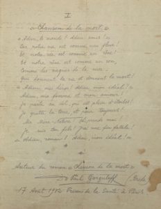 GORGULOFF (Paul) — Évangile de la Nature. Manuscrit autographe signé, daté du 6 août 1932 à la Prison de la Santé, à Paris. (23 pp. in-12 pliées en livret). – Chanson de la mort. Poème autographe signé, daté du 17 août 1932 au même endroit. (1 p. in-4).