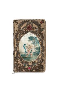 (2 lots joints) [ALMANACHS - RELIURES BRODÉES] Ensemble 2 ouvrages. - Etrennes mignonnes pour l'An de N. Seigneur M.DCCLXXXI. Depuis le commencement du monde... Liège : Veuve J. Dessain, s. d. [1781]. In-24, (4) feuillets (dont titre), (12) feuillets de calendrier interfoliés de (12) feuillets blancs et (38) feuillets illustrés. Reliure de l'époque en soie ivoire brodée de guirlandes florales de fils d'or et sequins, au centre de chaque plat est insérée une miniature peinte sur papier en médaillon. Jolie reliure de l'époque en soie brodée, ornée de deux miniatures à sujets galants, la première représentant un angelot coiffé d'un chapeau et tenant un bâton, surmontée de l'inscription : «Je suis égaré», la seconde figurant un angelot armé d'un arc et d'un carquois pointant vers le plastron d'une armure, accompagnée de la légende : «Rien ne résiste à mes coups». L'almanach est illustré de 12 pages de monnaies gravées sur bois (2 par page), et de petits signes du zodiaque dans le calendrier. De Theux 491 - 192 ; Saffroy, Almanachs, 257. (Soie passée et salie, sequins et fils métalliques ternis). - Etrennes instructives, curieuses et mignones [sic], ou Almanach sans pareil, pour 1818. Paris : Blocquel, s. d. [1818]. In-24, 128 pages, une grande planche dépliante de mappemonde. Reliure de l'époque en soie ivoire, premier plat brodé de guirlandes et motifs floraux de fils d'or et sequins dorés et de couleurs. L'almanach est illustré d'une grande planche dépliante avec un planisphère au recto, et des 10 pavillons gravés de diverses puissances au verso. Carteret n° 1862 (édition de 1819). (Quelques petites taches sur la reliure, fils et sequins un peu ternis)