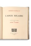 BATAILLE Georges - MASSON André L'Anus solaire. (Paris, Galerie Simon, 1931). In-4 ; monté sur onglets, reliure souple en veau marron glacé à motifs bruns et or, disque au premier plat entouré du titre doré, couverture rempliée, sous emboîtage (Devauchelle). Édition originale de ce texte poétique écrit en 1927 par Georges Bataille, illustré de trois pointes-sèches originales d'André Masson. Un des 100 exemplaires sur Vergé d'Arches signé par l'auteur (n°66). Superbe exemplaire.