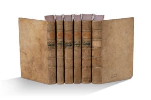 RAYNAL, Guillaume-Thomas (1713 - 1796) Histoire philosophique et politique des établissemens & du commerce des Européens dans les deux Indes. La Haye : Gosse fils, 1774. 7 tomes en 6 volumes in-8, portrait gravé de l'auteur, (4)-viii-438 pages ; viii-312-(3) pages ; xii-440 pages ; viii-301 pages ; xi-296-viii-287 pages ; viii-326 pages ; 7 frontispices et 7 cartes dépliantes. Vélin rigide de l'époque, dos à nerfs, pièces de titre et de tomaison (manquante sur le dernier volume). Seconde édition de «la première bible de l'anti-esclavagisme» (François Moureau). Elle est illustrée de 7 frontispices d'après Charles Eisen gravés par Baquoy, Gaucher, Launay, Longueil, Masquelier et Née, et de 7 cartes dépliantes. Pour établir cette histoire de la colonisation issue d'une commande, l'abbé Raynal s'entoura de collaborateurs partisans des Lumières, dont d'Holbach et Diderot. Sous couvert de relater l'histoire des explorations et des installations commerciales européennes dans le monde, l'entreprise se mua en critique déguisée du despotisme royal, du fanatisme catholique et du colonialisme. La première édition parut en 1770 et, deux ans plus tard, fut condamnée au feu par le parlement et l'Église, comme la seconde par la suite. Relié après le 7e tome dans le dernier volume : [BERNARD, François]. Analyse de l'Histoire philosophique et politique des établissemens & du commerce des Européens dans les deux Indes. Leyde : J. Murray, 1775. In-8, VIII-245 pages. Première édition de cette critique de l'ouvrage de l'abbé Raynal. Sabin 68080 ; Cohen 855 ; En français dans le texte 166. (Mouillure au portrait et au frontispice dans le 1er volume)