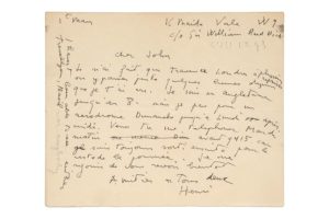 CARTIER-BRESSON Henri (1908 - 2004) photographe L.A.S. «Henri», Londres 1er mars, à son cher John ; 1 page oblong in-8. Il loge chez le sculpteur Sir William Reed Dick : «Je n'ai fait que traverser Londres à plusieurs reprises ou y passer quelques heures depuis que je t'ai vu. Je suis en Angleterre jusqu'au 8. Mais je pars pour un aérodrome dimanche jusqu'à lundi après-midi». Il demande de lui téléphoner le matin, car il sort le reste de la journée. Il se réjouit de le revoir bientôt et ajoute ironiquement, en anglais, en post-scriptum qu'il n'a pas pu rencontrer Basil Trevellyan [fameux héros de roman].