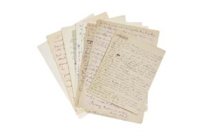 CHAISSAC Gaston (1910-1964) 9 L.A.S. «Gaston Chaissac» dont 3 avec DESSIN, 1943 - 1962 et s.d., aux galeristes René et Denise BRETEAU ; 22 pages in-4 ou in-fol. Intéressante correspondance montrant les liens étroits entre Chaissac et les Breteau qui soutinrent et exposèrent l'artiste. Vix début 1943. Il se rappelle au galeriste pour réclamer des dessins, «surtout des dessins à la plume fait en 1939 en Dordogne». Il le prie de lui trouver des travaux d'artisanat ; jouets, sellerie, abat-jours... «Mes dessins, mes peintures, j'aimerai en échanger contre des dessins, des peintures d'autres et même des reproductions. J'ai fait beaucoup de choses nouvelles, des trouvailles durant ces dernières années», notamment «des papiers décorés. Il a écrit aussi, et indique qu'Albert Gleizes l'avait encouragé à publier ses textes, pour lesquels il aurait écrit une préface. Il annonce son récent mariage et la naissance de sa fille Annie... Boulogne par les Essarts [1947 ?]. Il s'intéresse à «un authentique graffitisseur » Maurice Charrieau, et il se dit «l'homme qui obéit aux épluchures ». Puis il raconte longuement un rêve auquel est mêlé Dubuffet, et recopie quatre de ses nouveaux poèmes, et des aphorismes sur les épluchures... Sainte-Florence-de-l'oie [fin 1948]. Les gens ne s'intéressant plus aux dessins sur papier, il en fait sur des coloquintes, qu'il propose à Breteau d'exposer. «Et je fais de la propagande anti-alcoolique pour plaire aux bonnes femmes pour qu'elles me commandent des peintures murales». Il parle de son nouveau domicile, puis de ses «crucifixions d'une nouveau genre», et d'un tableau fait d'après Picasso, etc. 1961. 1er juin. Sur son portrait fait par Michel Degenne (dessin en pleine page au dos, au crayon gras). - Vix 13 octobre. «Je n'ai toujours pour peindre que le grenier si chétivement éclairé. Tout pour m'inciter à faire la grève sur le tas aussi j'écris plutôt. Pourtant j'étais au grenier à peindre mercredi après-midi lorsque le curé est venu faire sa visite paroissiale. Ma femme qui n'est pas d'accord avec lui n'arrêta pas sa machine à laver pour lui et leurs éclats de voix arrivaient jusqu'à moi [...] Notre demeure aurait fort besoin d'être surmontée d'un mirador [...] J'ai quelques grands tableaux nouveaux nés qui doivent finir de m'illustrer, du moins espérons-le»... Il joint un poème sur la ferme du Petit Montnommé ; au dos de la lettre, dessin au stylo bleu d'un personnage. 1962. Vix 3 janvier. Il a fait «un grand dessin colorié qui représente un peau rouge aux yeux jaunes [...] Mon nouveau stock de gouaches commence à devenir considérable» ; il parle de ses ennuis de santé... - 11 janvier. «Mon mirador, c'est pas hélas encore pour tout de suite. Je viens de peindre mon monstre du jour (11.1.62) qui a un oeil qui dit un peu merde à l'autre mais doit être quand même une réussite dans son genre. Ses pieds bleus plongent dans du jaune oeuf un peu éclairci [...] Croyez vous que je pourrais obtenir en échange de tableaux de la camelotte de quoi ouvrir une boutique ? On m'a écri que la galerie qui m'exposera à Nantes semble être un îlot de propreté parmi l'océan des merdes polychromes nantaises»... Etc. On joint 2 fins de L.A.S. (2 p. in-4 chaque), parlant de ses gouaches, de Dubuffet, de ses rêves... (Quelques petites fentes)
