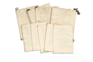 COYPEL Charles-Antoine (1694 - 1752) 2 Manuscrits Les Désordres du jeu, Comédie en trois actes ; 44 feuillets petit in-4 (plus qqs ff. blancs) en 7 cahiers cousus d'un ruban bleu, tranches dorées (mouillures), et 83 feuillets in-8 en 7 cahiers cousus de fil bleu, tranches dorées. Deux manuscrits complets de cette pièce inédite. Le peintre et graveur Charles-Antoine Coypel était aussi auteur dramatique, et fut directeur de l'Académie royale de musique ; une seule de la quarantaine de ses pièces fut publiée, Les Folies de Cardenio. Le duc de La Vallière possédait un manuscrit du Théâtre de Charles Coypel, en 6 volumes in-4, rassemblant 21 pièces (n° 3463), dont (6) Les Désordres du jeu : «Toutes ces pièces de Charles Coypel, d'une famille fertile en Peintres, mort en 1752, n'ont pas été imprimées. Il étoit fort jaloux de ne pas les rendre publiques, & c'est par une preuve de la plus grande confiance que M le Duc de la Vallière a eu une copie de toutes celles qu'il avouoit.» Belles copies soignées, de cette comédie en 3 actes, en prose, restée inédite. Elle met en scène Géronte, ses deux fils Valère et Éraste ; les autres rôles sont : Chrisante, beau-père de Valère, Argante, ancien ami de Géronte, le Chevalier, ami de Valère, un jeune enfant, fils de Valère ; et trois valets ou laquais.