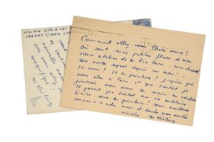KISLING Moïse (1891 - 1953) 2 L.A.S., 1933 - 1939, à Madame JASMY-ALVIN ; 2 cartes postales avec adresses, dont une illustrée d'une vue de Sanary. Lettres amicales à l'ancienne compagne de Van Dongen. Sanary 1er janvier 1933. Voeux pour la nouvelle année : «elle sera vous allez voir magnifique !»... Versailles 7.X.1939, Dépôt de Guerre du Génie. Il évoque son atelier de la rue Bara : «Me voilà sapeur depuis un mois ! Et vous ? Et la peinture ?» Il espère pouvoir lui serrer la main à Paris, «en confrère» : «Il paraît que bientôt ma vie militaire finira. Vive la peinture !»...