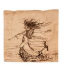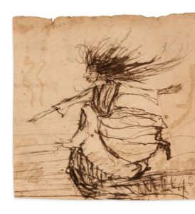 MUSSET (Alfred de) (1810-1857). Attribué à Dessin aut. «La Sorcière». s.d. (1829). Dessin original, encre et plume (5,5 x 5,5 cm), encadrement sous verre. Belle représentation d'un personnage féminin, échevelée sous l'effet d'un vent violent, à l'apparence effrayante d'une sorcière. Image faisant référence à quelques oeuvres de jeunesse de Musset, notamment dans un passage de la pièce Les Marrons du feu (1829) : (...) La sorcière, accroupie et murmurant tout bas des paroles de sang, lave pour les sabbats, lave pour les sabbats la jeune fille nue ; Hécate aux trois visages froisse sa robe blanche aux joncs des marécages. Ecoutez. - L'heure sonne ! et par elle est compté chaque pas que le temps fait vers l'éternité (...). Autre grande figure de sorcière chez Musset, la Belisa, dans la pièce Don Paez (1829). PROVENANCE Ancienne collection Christian Bernadac. Collection Pierre et Franca BELFOND (Artcurial14 février 2012, n° 91). BIBLIOGRAPHIE Serge Fauchereau, Peintures et dessins d'écrivains (Belfond, 1991, p. 19). Dessinsd'écrivains (Chêne, 2003, p. 26).