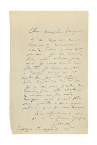 RENOIR Auguste (1841 - 1919) L.A.S. «Renoir», Essoyes 1er septembre 1906, à Maurice GANGNAT ; 1 page in-8. Il a «reçu une énorme caisse de macarons variés dont je me régale souvent. Je ne savais pas votre adresse sans quoi je vous aurais écrit plus tôt. Je suis encore à Essoyes jusqu'au 15 septembre, peut-être plus, cela dépendra du temps. Je n'ose vous parler de venir par cette chaleur, le mieux est de moins bouger mais quand cela sera possible ce sera avec plaisir que je vous reverrai»...