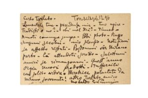 PUCCINI Giacomo (1858 - 1924) L.A.S. «G. Puccini», Torre del Lago 6 décembre 1896, à Carlo CLAUSETTI, chez Ricordi à Naples ; 1 page oblong in-12, adresse au verso (Cartolina postale) ; en italien. Lettre amicale à «Carlo Tarlato», avant de regagner Milan, et promettant dans l'année une «orgia nuovi prodotti».. On joint une L.A.S. de Paul ELUARD à José Corti (24 novembre 1939 ; 1 p. in-8, enveloppe), donnant des nouvelles de Max Ernst et Bellmer internés dans un camp.
