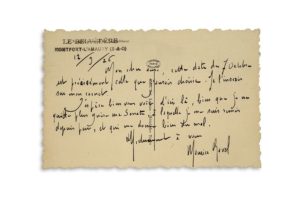 RAVEL Maurice (1875 - 1937) L.A.S. «Maurice Ravel», Le Belvédère, Montfort-l'Amaury 12 septembre 1926, [à Maurice JAUBERT] ; 1 page oblong in-12 au dos d'une carte postale illustrée (Montfort-l'Amaury. Panorama Nord). Il espère le voir avant le 7 octobre (mariage de Jaubert, dont Ravel sera le témoin avec Roland-Manuel), «bien que je ne quitte plus guère ma Sonate [Sonate pour violon et piano], à laquelle je me suis remis depuis peu, et qui me donne beaucoup de mal»... [Ravel, L'Intégrale, n° 1993].