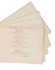 ALBUM AMICORUM Ensemble de 25 feuillets avec poèmes et P.A.S. de divers écrivains ; 25 feuillets oblong in-4 tirés d'un album, tranches dorées. Poèmes par Jacques ANCELOT (Adieux de Lord Byron à Venise, annoté par J. Janin), Émile BARATEAU (Pour Marie, quand elle aura trois ans), Hippolyte BIS (Fragment du Cimetière en vente), Louis BOULANGER («Il est au fond des forêts sombres»...), Edmond COTTINET (Octobre), Antoni DESCHAMPS («Dans ce temps d'égoïsme»...), Alexandre DUMAS père («Vierge à qui le calice à la liqueur amère»..., avec note de Jules Janin), Charles DUPEUTY («Excusez-moi, je ne vous connais pas»...), Charles-Guillaume ÉTIENNE (extrait de la comédie des Deux Gendres), Ernest FOUINET (Sonnet écrit pour la loterie tirée à l'opéra, au profit des pauvres), Jean-Baptiste de PONGERVILLE («Si tout périt en nous»...), SAINTE-BEUVE (Sonnet à Madame xxx), Eugène de PLANARD (Prologue inédit de La Belle au Bois dormant, opéra-comique), J.B.A. SOULIÉ (À la Lune), Alexandre SOUMET (fragment de l'Enfer racheté), Alfred de VIGNY (L'Esprit Parisien, Sonnet pour la fête de la mi-carême à l'Opéra, au bénéfice des pauvres), Jean-Charles VIAL («Monsieur de Castignac»... sizain)... Textes divers par Virginie ANCELOT, Antoine JAY, P.F. TISSOT (Sur la jeunesse de notre temps), Joseph MICHAUD, etc.