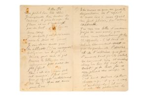 APOLLINAIRE Guillaume (1880-1918) L.A.S. «Gui», 3 mai 1915, à Louise de CHÂTILLON-COLIGNY ; 4 pages in-8 (quelques légères taches). Belle lettre d'amour à Lou, écrite du front. «Mon petit Lou très chéri. Je comprends bien toutes les tensions, le printemps, les fleurs et ne t'en veux pas du tout, ptit Lou de mon coeur. [...] Alors c'est vrai, mon joli rat musqué, il faut aussi que je compte entièrement sur toi ?! et on est amis pour la vie ! Si tu savais ce que ces gentilles dispositions de l'esprit de mon Lou à mon égard me font plaisir, tu serais contente». Il a reçu une lettre d'un ami sous-préfet «qui envie des sensations fortes et exquises. C'est tout de même étonnant ce que les poilus de l'arrière et de l'intérieur qui font l'amour tout ce qu'ils veulent, ne risquent rien et couchent dans un bon lit ont du culot, je te leur f...ai avec plaisir des coups de bâton. C'est tout de même extraordinaire ce qu'il y a encore d'embusqués ! Et on parle de prendre les femmes aux armées, mais qu'on prenne d'abord tous les hommes... J'ai interrompu ma lettre pour monter à cheval dans la nuit noire sans lune été aux tranchées dans l'encombrement impressionnant des nuits du front. Sentinelles partout. Le mot. Puis la rase campagne. Les réflecteurs puissants qui balayent l'obscurité. Des fusées lumineuses perçant les ténèbres, la fusillade, c'était fantastique. J'ai cueilli aujourd'hui des fleurs que je mets sur ma lettre. Il y a là le premier lilas» [taches brunes sur la lettre]. Quand pourront-ils aller le cueillir ensemble ?... «Ici rien de neuf que la guerre»... Il se demande ce qu'on pense à Paris de la durée de cette guerre, et si l'Italie va entrer en guerre, ou bien «nous faire attendre sous l'orme comme moi à Marseille ? Mon ptit Lou aurais voulu voir le pigeonnier avec ses beaux iris noirs et ses oeillets mutins fripons dont tu parles si bien. Enfin, mon chéri, je t'embrasse mille fois»...