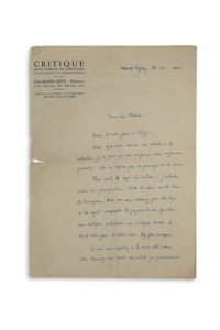 BATAILLE Georges (1897 - 1962) L.A.S. «Georges Bataille», Vézelay 28 décembre 1947, à Gaston FERDIÈRE ; 1 page et quart in-4 à en-tête de la revue Critique (petit accident) Il le remercie d'avoir pensé à Critique, mais «après avoir soumis vos articles à la rédaction, je ne puis que vous confirmer mon impression première : cela ne répond pas au principe de la revue. Rien contre le sujet (au contraire). J'attends même (en principe) une étude de LEIRIS sur le livre de CARRINGTON. Mais vous vous adressez peut-être trop à des esprits auxquels la psychiatrie est familière, sans toutefois introduire une analyse serrée. Le ton, d'autre part, est selon nous trop peu ennuyeux. Si vous vous reportiez à la revue elle-même, vous trouveriez sans doute des articles qui présentaient des inconvénients du même ordre. Mais c'était selon nous des erreurs»...