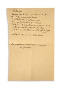 BRECHT Bertolt (1898 - 1956) POÈME autographe, Nordlandschaft, [1920] ; demi-page in-fol. ; en allemand. Rare poème de jeunesse. Ce manuscrit est resté inconnu des éditeurs de Brecht. Le poème a été recueilli, sous le titre Nordlandssage dans les OEuvres complètes d'après un tapuscrit fautif : Werke. Große kommentierte Berliner und Frankfurter Ausgabe, Bd. XIII (Gedichte 3), p. 193 (commentaire p. 469). Le poème compte neuf vers, le dernier séparé des huit autres par un grand blanc. «Sie zogen von den Bergen groß und fett mit roten Haaren Eherne Waffen in den großen Händen die selbst wie ungeschlachte Tiere waren. [...] Abends wenn der Wind im dunklen Wipfel der Pappeln sauste redeten sie allesamt vom blauen Meere. Darin ersaufen sie bald bei Kupferneumond wie zu schwere Tiere». Tarduction libre du début de ce Paysage du Nord : «Ils sont descendus des montagnes grands et gras avec des cheveux roux / armes d'airain dans les grandes mains / qui étaient eux-mêmes comme des bêtes disgracieuses...