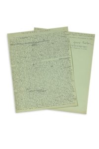 BRETON André (1896 - 1966) MANUSCRIT autographe signé, Printemps secret, 1955 ; 1 page et quart in-4, d'une écriture serrée sur papier vert d'eau. Chronique datée en fin 1er avril 1955, avec ratures et corrections ; publiée dans Arts, le 6 avril 1955. «Ce printemps qui tarde à naître, tout au moins ajourne ici l'exaltation de la chair de la femme par cette brusque floraison de toilettes légères qui est la grande fête de l'année, semble d'abord vouloir se faire quêter dans les tableaux et dans les livres»... Et Breton rend compte du recueil de poèmes de Robert DROGUET, Féminaire, puis du scandale de l'exposition des tableaux de Max Walter SVANBERG à la galerie «À l'Étoile scellée», «scandale, une fois de plus au profit de la femme et de tout ce que l'on peut requérir d'elle en bravant même parfois contre elle tout anachronisme jusque dans le culte exclusif qu'on peut lui vouer»...