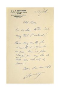 CÉLINE Louis-Ferdinand (1894 - 1961) L.A.S. «Destouches», Meudon 6 juillet [1957], à Paul CHAMBRILLON ; 1 page in-8 à son en-tête Dr L.-F. Destouches Lauréat de la Faculté de Médecine de Paris, enveloppe. «Cher ami, Ci inclus lettre dont verrez tout l'intérêt ! Vous serez nouvelle fois fort aimable d'y répondre en mon lieu et place chargé que vous êtes de tous mes intérêts du genre !»... [Il s'agit du disque Louis Ferdinand Céline par Arle tty et Michel Simon , édité par Chambrillon.]