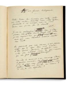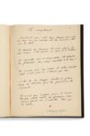 CHAR René (1907 - 1988) 11 POÈMES autographes pour Fureur et mystère, et 3 L.A.S. «René Char» à Roland SAUCIER, [1947 - 1948] ; le tout monté sur onglets et relié en un volume in-4 maroquin noir janséniste doublé du même maroquin, gardes de daim grises, chemise et étui (Monique Mathieu, 1998). Bel ensemble de onze poèmes pour Fureur et mystère. Publié en 1948, Fureur et mystère regroupe trois recueils antérieurs, et deux nouveaux ensembles auxquels se rattachent ces onze poèmes : les cinq premiers font partie de la section Les Loyaux Adversaires, les six derniers du cycle La Fontaine narrative. Ces onze poèmes autographes sont écrits à l'encre noire sur 13 feuillets in-4 (27 x 21 cm), la plupart sont des mises au net, souvent sur une page (sauf indication contraire). Sur la nappe d'un étang glacé (4 vers sur 1 page) : «Je t'aime, / Hiver aux graines belliqueuses»... Crayon du prisonnier (5 vers avec une correction) : «Un amour dont la bouche est un bouquet de brume»... Cur secessisti ? (en prose) : «Neige, caprice d'enfant»... Cette fumée qui nous portait (en prose) : «Cette fumée qui nous portait était soeur du bâton qui dérange la pierre et du nuage qui ouvre le ciel»... La Patience, suite de 4 poèmes (2 pages) : Le moulin (5 vers) : «Un bruit long qui sort par le toit»... ; Vagabonds (4 vers) : «Vagabonds, sous vos doux haillons»... ; Le nombre (5 vers, correction au dernier) : «Ils disent des mots qui leur restent au coin des yeux»... ; Auxiliaires (8 vers, titre primitif biffé : Rapport de guet) : «Ceux qu'il faut attacher sur terre»... Fastes (en prose) : «L'été chantait sur son roc préféré quand tu m'es apparue»... Le martinet (6 versets) : «Martinet aux ailes trop larges, qui vire et crie sa joie autour de la maison, tel est le coeur»... Madeleine à la veilleuse par Georges de la Tour (prose) : «Je voudrais aujourd'hui que l'herbe fût blanche pour fonder l'évidence de vous voir souffrir»... À une ferveur belliqueuse, signé et daté «(25-12-47)» (7 versets, 2 pages, nombreuses ratures et corrections ; au bas de la 2e page, note biffée de Char au stylo bleu : «écrit à S. Il faut marcher plus doucement, petite fille sans coeur») : «Notre-Dame-des-Lumières, qui restez seule sur votre rocher»... Assez creusé (prose, une correction) : «Assez creusé, assez miné sa part prochaine»... Allégeance, daté «(1948)» (4 versets ; trois titres primitifs biffés Magie [?], La main et les étoiles et Reviviscence ; une addition au 3e verset) : «Dans les rues de la ville, il y a mon amour»... Au bas de chaque texte, on a ajouté, au stylo bleu et au crayon, le titre du recueil (Fureur et mystère) et le numéro de page correspondant au bas de chacun des poèmes. Les 3 lettres au libraire et collectionneur Roland SAUCIER (1899 - 1994), 16-23 novembre 1948, renseignent sur l'histoire de ces poèmes. Le 16 novembre, il lui adresse «en communication [...] onze de mes poèmes (Fureur et mystère)», ainsi que La Nuit du Tournesol d'André Breton, en précisant : «Il n'existe pas de manuscrit complet de F. et M.». Le 23 novembre, il indique : «Si extraordinaire que cela vous paraisse je n'entre pas dans la catégorie des auteurs dont les manuscrits sont recopiés à perpétuité. Depuis 1944 je crois bien n'avoir vendu, sur sa demande, qu'à Matarasso des poèmes manuscrits de moi (Habituellement je les offre [...] Je brûle la plupart de mes brouillons et suis quelquefois fort surpris d'avoir brulé l'original même sans espoir de le réinventer tant le feu est mon allié et mon confident». Il vend à Saucier le manuscrit de Breton et lui offre les siens...