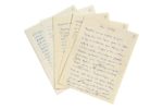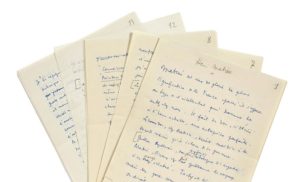 COCTEAU Jean (1889 - 1963) MANUSCRIT autographe signé «Jean Cocteau», Henri Matisse, Milly août 1949 ; 16 pages in-4. Bel hommage à Matisse. Ce texte sur Matisse, écrit en août 1949, ne semble pas avoir été publié à l'époque ; une version plus courte a paru dans la revue Livres de France en octobre 1955. Le texte a été récemment publié dans les Écrits sur l'art (Gallimard, 2022, p. 245 - 250).) Le manuscrit est rédigé au stylo bille bleu (sauf la page 12 ajoutée au crayon), avec de nombreuses ratures, corrections et additions au crayon ; il présente plusieurs paragraphes inédits, et des variantes par rapport au texte édité. «MATISSE est une des gloires les plus significatives de la France parce qu'il s'oppose au type d'intellectuel qui domine les arts chez nous. Il fait du don, si décrié à l'heure actuelle, une entreprise parfaite». Cocteau renvoie à Guillaume APOLLINAIRE qui, «dans la préface du catalogue d'exposition Matisse, Picasso chez Paul Guillaume le compare à une orange éclatée. Tâches et lignes, sa main se pose comme une pierre de base. [...] Matisse, selon la phrase si belle de Picasso, trouve d'abord et cherche après, voilà sa grande merveille. [...] Jamais main plus libre ne fut mise au service d'un esprit si jeune. Jamais richesse pareille ne tomba entre des mains plus économes. Jamais vous n'aurez un exemple plus éclatant du contrôle immédiat de l'instinct.» Cocteau évoque le décor pour Le Rossignol de STRAWINSKY chez Diaghilev : «On aurait pu s'attendre à une jungle de couleurs. Il n'en était rien. Le rideau se levait sur un vide bleu pâle organisé par ce goût qui est le contraire du bon goût et qui étonne à force d'être simple». Cocteau redit son admiration profonde pour Matisse et PICASSO : «ils peignent aux antipodes - sauf en ce qui concerne le dépouillement et l'absence totale de sottise. L'un projette des graines, l'autre combine des greffes. L'un perturbe le trafic sans malice. L'autre est un perturbateur du trafic et médite ses accidents.» Le génie de Matisse est évident et «Matisse, comme tous les génies, est un assassin. Il est entouré du nimbe dont les assassins s'auréolent. Il règne par grâce divine, par on ne sait quel privilège de l'âme» comme «l'or que nul n'imite et qui exerce une domination mystérieuse». À propos de la couleur : «On dirait que Matisse arrose une toile et que les couleurs y poussent. Le soleil termine le travail. Il se pourrait que dans un ensemble des oeuvres de Matisse, les salles d'exposition embaumassent». Cocteau essaie de définir la peinture abstraite : «Elle semble inconcevable puisque l'abstraction cesse de l'être à la minute où elle et représentée. [...] Aux antipodes l'un de l'autre, Matisse et Picasso poussent le réalisme jusqu'au point où l'abstraction ne saurait être mise en cause». Il n'ose aborder le côté technique qui lui semble être un combat contre l'objet inerte : «Je suppose que Matisse entre en lutte avec les matières qui lui servent à peindre [...] Le génie consiste à effacer les traces de cette lutte à la seconde où elle éclate». Il montre à nouveau les différences de Picasso et Matisse dans leur représentation du couple et conclut : «Peu d'hommes ont eu pareil acharnement à se mettre en pointe, à s'exposer, à s'engager en eux-mêmes jusqu'à la limite du possible. Il ne reste alors que l'échec pour contrebalancer trop de réussite et traverser la zone d'ombre où les héros se baignent, deviennent invulnérables et s'assurent l'immortalité».