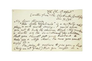 DODGSON Charles Lutwige dit LEWIS CARROLL] (1832 - 1898) L.A.S. «C L. Dodgson», Guilford 29 novembre 1896, à «My dear Minnie» [Milicent Horatia MURDOCH] ; 2 pages oblong in-8 ; en anglais. Au sujet de la pièce Two Little Vagabonds, qui est une bonne pièce et vaut la peine d'être vue. Mais il lui déconseille d'emmener les enfants à cause des meurtres et des morts («the murders & deaths are too sensational for children»), mais elle peut emmener son mari et Miss Moore. Il se permet de lui demander d'avoir la bonté de s'occuper de sa nièce Minella Dodgson (dite Nella), qui vit tout près, et de l'inviter chez elle pour illuminer sa triste vie de maîtresse d'école ; elle a 19 ans :«I don't think you would find her at all disagreeable»... On joint une photographie de REICHMANN.
