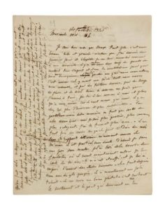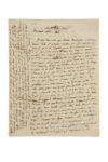 FLAUBERT Gustave (1821 - 1880) L.A., Mercredi soir [14 octobre 1846], à Louise COLET ; 4 pages in-4. Belle et longue lettre à Louise Colet, notamment sur son ami Maxime Du Camp. La première partie de la lettre est consacrée à un éloge de Maxime DU CAMP, tant sur le plan affectif que littéraire : «C'est une bonne belle et grande nature que j'ai devinée du premier jour [...] Il y a entre nous deux trop de points de contacts dans l'esprit et dans la constitution pour que nous nous manquions. [...] Aime le comme un frère que j'aurais à Paris. Fie toi à lui comme à moi et plus qu'à moi, même car il vaut mieux que moi. Il y a chez lui plus d'héroïsme et plus de délicatesse - la gentilhommerie de ses manières ne fait que sortir de celle de son coeur. Moi je suis plus grossier, plus commun, plus ondoyant. J'ai le fumet plus âcre. - Il ne faut pas en croire ce qu'il peut te dire de moi sous le rapport littéraire. M'aimant comme il m'aime il est partial sans doute. D'abord je suis un peu son maître. Je l'ai tiré de la bourbe du feuilleton où il serait maintenant enfoui pour le reste de sa vie [...] je lui ai inspiré l'amour des études sérieuses. Il a fait depuis deux ans de grands progrès. Il a maintenant un joli talent [...] c'est surtout le sentiment et le goût qui dominent en lui. Il attendrit, je connais une chose de lui que je ne peux pas lire sans larmes dans les yeux ; et avec toutes ces bonnes qualités il est modeste comme un enfant»... Puis Flaubert met en garde Louise contre les journalistes qui répandent des louanges sur lui et qui ne sont pas toujours sincères : «J'ai passé pour être tant de choses et on m'a trouvé des ressemblances avec tant de gens ! Depuis ceux qui ont dit que je m'étais rendu malade par l'abus des femmes, ou des plaisirs solitaires, jusqu'à ceux qui me disaient pour me flatter que je ressemblais au duc d'Orléans»... Il évoque ensuite le drame que Louise Colet est en train d'écrire (Madeleine, 1850), et espère pour elle et lui un triomphe. Depuis la mort de son père et de sa soeur, l'ambition et le succès l'indiffèrent ; il a reporté tous ses espoirs sur elle et la conseille dans son travail : «Serre ton style, fais un tissu souple comme de la soie et fort comme une cotte de mailles. Pardon de ces conseils mais je voudrais te donner tout ce que je désire pour moi». Il travaille actuellement à des choses qui l'ennuient et espère se remettre à écrire au printemps prochain : «Mais je recule toujours. Un sujet à traiter est pour moi comme une femme dont on est amoureux. Quand elle va vous céder on tremble et on a peur»... Il termine par une violente semonce contre les critiques : «C'est perdre son temps que de lire des critiques. Je me fais fort de soutenir dans une thèse qu'il n'y en a pas eu une de bonne depuis qu'on n'en fait - que ça ne sert à rien qu'à embêter les auteurs et à abrutir le public - et enfin qu'on fait de la critique quand on ne peut pas faire de l'art». Il regrette finalement que sa haine de la critique ne lui laisse plus de place pour embrasser son amie, mais, il lui envoie quand même «avec leur permission, mille grands baisers sur ton beau front et sur tes yeux si doux et ...» Correspondance (Pléiade), t. I, p. 388.