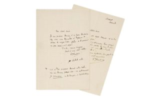 FLAUBERT Gustave (1821 - 1880). 2 L.A.S. «Gve Flaubert», [mai-juin 1879, à Jeanne de TOURBEY, comtesse de LOYNES] ; 1 page in8 chaque. Croisset mercredi [14 mai]. Il n'est pas allé la voir, n'ayant passé à Paris que quelques heures, et «votre escalier m'a fait peur !». Mais il y retourne dans quinze jours, et compte y rester une partie du mois de juin. Il termine : «D'ici là, je vous embrasse bien fort. Votre vieil amoureux Gve Flaubert». [Paris] Vendredi midi [6 ou 13 juin]. Il compte venir chez sa «chère belle» demain, «vous demander à déjeuner (c'est à dire m'asseoir devant votre table. Ne me donnez presque rien - ou autrement je pioncerais sur les bouquins, à la bibliothèque). Ce sera le moyen d'être seuls & de pouvoir un peu causer»... On joint une L.A.S. d'Émile ZOLA, Grand-Camp 29 août 1881, à Alphonse DAUDET (2 p. in-8 deuil, petit accident), au sujet de Numa Roumestan, «une de vos oeuvres les plus personnelles et les plus équilibrées» ; il va lui consacrer un article...
