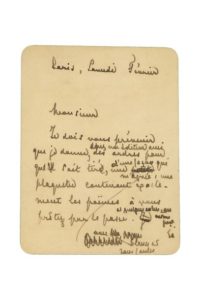 MALLARMÉ Stéphane (1842 - 1898) L.A. (minute), Paris Samedi février [1887 ?, à Léon VANIER] ; 2 pages in-12 (carte), avec de nombreuses ratures et corrections. Brouillon très raturé de la lettre de rupture avec l'éditeur Léon Vanier. [En 1886, pour quelques centaines de francs, Mallarmé cède à Léon Vanier, avec qui il a déjà signé un contrat en 1885, pour les Poèmes d'Edgar Poe, le droit de publier le Faune sous une forme modeste, à un millier d'exemplaires. Le contrat prévoit le rhabillage des exemplaires de l'édition Derenne. Mais, pour les Poèmes d'Edgar Poe comme pour le Faune, les démêlés se multiplient avec Vanier. Mallarmé le fait traduire en justice en septembre 1887. Dès mars 1887, il a pris les devants et La Revue indépendante dirigée par Édouard Dujardin imprime une nouvelle édition, à couverture brique et dite «définitive» de L'Après- Midi d'un Faune. C'est une édition, en neuf cahiers photolithographiés, des manuscrits de Poésies ; le Faune, dans lequel les bois de Manet ne figurent pas, est le sixième, tiré à 47 exemplaires, avec frontispice de Félicien Rops.] Il le prévient «que je donne chez un éditeur ami des ordres pour qu'il soit tiré, d'une façon qui m'agrée, une plaquette contenant exactement les poëmes à vous prêtez [sic] par le passé et quelques autres avec blancs et sans fautes. Je supprime, cela va de soi, votre titre mais indique que cette nouvelle Anthologie de mes oeuvres, est la seule publication reconnue par moi. Je vais enfin m'occuper de ce qui peut rester de l'édition au nom de Vanier faite au même prix et mettre opposition à son débit. J'aurais dû agir tout de suite aussi, sans me laisser prendre à vos atermoiements»... On joint une L.A.S. d'Alfred de VIGNY, 5 mars 1854, invitation à venir prendre le thé avec Brizeux (1 p. ¼ in-8).