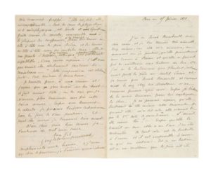 MAUPASSANT Guy de (1850-1893) L.A.S. «Guy de Maupassant», Paris 15 février 1878, à sa mère Madame Laure de MAUPASSANT à Étretat ; 4 pages in-8, enveloppe. Très intéressante lettre à sa mère, sur son drame historique en vers La Trahison de la comtesse de Rhune, la protection de son maître Flaubert, et la préparation de son roman Une vie. «J'ai vu Sarah BERNHARDT, ma chère mère, et je l'ai trouvée très aimable, trop même, car elle m'a annoncé, au moment où je partais, qu'elle présenterait mon drame à Perrin et qu'elle se faisait fort de m'obtenir une lecture de lui. Or j'ai su le lendemain que Flaubert justement avait porté la pièce au susdit Perrin et je crains que Sarah Bernardt, se cassant ainsi le nez chez son Directeur n'en revienne furieuse après moi. Enfin je tâcherai de la revoir demain pour lui expliquer la chose. Je ne pouvais espérer qu'elle tenterait elle-même cette démarche. Or quand elle m'a dit cela elle n'avait lu que le 1er acte de mon drame. L'avait-elle même lu ? - Enfin qu'elle le connût ou non elle a eu l'air d'en être enchantée. Or tout cela est la bouteille à l'encre et il est impossible de savoir ce qui en sortira»... Il ne sait si c'est un avantage que la pièce ait été présentée par FLAUBERT. «Le susnommé Flaubert a été bien maladroit pour moi. J'aurais pu, peut-être être nommé Sous-Bibliothécaire de l'École des Beaux-Arts, les appointements n'auraient pas été beaucoup plus élevés que ceux que j'ai en ce moment au ministère, mais la position est moralement bien supérieure, j'étais libre, et j'avais chaque année un congé du 1er août au 1er octobre. Malgré mes affirmations il a cru la chose impossible, a attendu, hésité, et l'herbe nous a été coupée sous le pied. Aussitôt qu'il s'agit de choses pratiques ce cher maître ne sait plus comment s'y prendre, il demande platoniquement et jamais effectivement, n'insiste pas assez et ne sait pas surtout saisir le moment. Enfin il est dupe quoi qu'il n'en convienne pas»... Il charge sa mère, croquis à l'appui, de faire réarranger ses chemises, puis raconte comment Mme Brainne décrit la nièce de Flaubert, Caroline COMMANVILLE : «“Elle est, dit-elle, incompréhensible - suit des cours de physiologie et de métaphysique, est dévote et républicaine, froide comme du marbre, inaccessible à la plupart des souffrances et des passions, passe des heures en tête à tête avec le père Didon et des heures en tête à tête avec ses modèles nus. Elle a une fermeté d'homme et un cerveau détraqué de femme ; elle est intolérante infaillible, d'une raison suprême”»... Maupassant approuve la comparaison avec Mme de Maintenon. Il ajoute : «Je travaille ferme à mon roman [Une vie, qui ne paraîtra qu'en 1883] et j'espère que j'en aurai un bon bout de fait avant l'été ; car tu sais que je n'avance plus beaucoup une fois cette saison arrivée. Enfin avec beaucoup de retards je finirai toujours certainement pour le jour de l'an prochain. Et peut-être aurai-je terminé bien avant»...