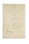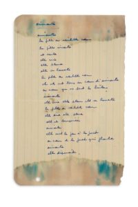 PRÉVERT Jacques (1900-1977) POÈME autographe, Aimante, et L.A.S. «Jacques» avec DESSIN, à Claudy CARTER ; 2 pages grand in-8 (21,5 x 14 cm, mouillures), et 2 pages in-fol. Poème et lettre-poème d'amour avec dessins. [Claudy Emanuelli dite Claudy CARTER a rencontré Prévert en 1938 : elle a seize ans, lui en a trente-huit ; elle sera sa compagne sous l'Occupation et lui inspirera les Feuilles mortes ; elle tournera dans plusieurs films ; ils se quitteront au bout de vingt ans. Aimante compte 20 vers, et n'a pas été repris en recueil ; au verso, dessin d'un paysage surmonté d'un grand soleil. «Aimante la fille au véritable coeur la fille vivante et seule elle crie elle pleure»... La lettre-poème est illustrée à la fin du dessin à la plume de quatre fleurs coloriées au crayon vert. «Tu te rappelles la dernière fois que je t'ai vue, c'était le matin, il pleuvait. Rue de Rivoli, à l'étalage d'une boucherie chevaline, nous avons regardé la tête d'un mulet, la tête coupée d'un mulet mort, elle était belle, son poil était doux et épais et le yeux calmes et doux comme si la bête si belle encore un peu vivait... [...] et tu te rappelles un nain est passé avec un gros bouquet de persil... Un nain qui pédalait sur un petit vélo... sous la pluie [...] il est tard. Il pleut... il y a de la boue et moi je suis dans une baraque et je t'écris... [...] Je t'embrasse... Ils ont enfermé le monstre dans le cabinet noir... (et tricolore) il va essayer de sortir... essaye de revenir le plu vite possible»...