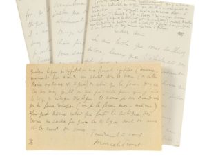 PROUST Marcel (1871 - 1922) 2 L.A.S. «Marcel Proust», [vers le 3 juillet 1920], à Jacques RIVIÈRE ; 12 et 8 pages in-8. Belle réunion sur son oeuvre et sur la critique. Proust s'inquiète de la santé de son ami, puis il confirme que «Jacques Porel a demandé à Gallimard que je fisse un article RÉJANE. Mais cet article pour beaucoup de raisons trop longues à écrire et dont nous causerons vous et moi, mais dont la principale est mon terrible état de santé, je ne pourrai pas l'écrire. Même court, cela me serait impossible. Or Porel m'écrit qu'il compte sur 26 ou 27 pages. Copeau (c'est une simple suggestion) ferait cela beaucoup mieux que moi, qui ne peux pas le faire du tout». Il voudrait lui «parler en toute liberté de la N.R.F.», dont le dernier numéro est «superbe, varié, plein, harmonieux» ; mais il a été choqué par certaines notes qui «ont q.q. chose de vraiment scandaleux», et il s'en prend à Jean de PIERREFEU, à qui il a écrit que ses «articles étaient par trop bêtes, cette critique tellement superficielle qu'elle allait forcément de contradictions en contradictions etc. [...] Naturellement le superficiel et brillant critique ne m'avait pas demandé mon opinion. Un amour stupide de la vérité me fit la lui donner de moimême. Je n'ai pas besoin de vous dire qu'il ne m'a pas répondu et que sa critique du Côté de Guermantes se ressentira, je n'en doute pas, de mes appréciations spontanées. Je comprends très bien que tout le monde n'en fasse pas autant et en somme c'est un de ces auteurs sur lesquels on peut, plus convenablement, garder le silence». Et il s'étonne d'avoir lu dans le dernier numéro de la revue, sous la plume de Roger Allard, «un éloge de M. de Pierrefeu où celui-ci était comparé à Velasquez (?) à Tallemant des Réaux, à Bussy-Rabutin». Il comprend qu'on puisse être amené à écrire des articles de complaisance. «Pour ma part, si j'avais été moins souffrant, sachant que des membres de l'Académie Goncourt que je ne connais pas, comme M. Élémir Bourges, se sont donné une peine touchante et folle pour me faire avoir le prix Goncourt, y ont pris des grippes etc., je ne me serais pas cru déshonoré pour leur octroyer du génie. Mais si j'avais fait cela, je l'aurais fait au Figaro, ou à Comoedia, ou au Gaulois, et non dans les colonnes de la scrupuleuse N.R.F. où on ne doit parler que de ce qui le mérite absolument [...] Des gens intelligents comme Léon Blum et bien d'autres, quand j'ai publié Swann ont dit : “Ce n'est pas cela qui peut donner une idée véritable de Proust. Qu'il publie ses pastiches, ils auront quarante éditions”. J'ai insinué qu'on pourrait les “lancer”. La N.R.F. fut d'un autre avis. Ils tombèrent à plat. Je donne les bonnes feuilles du Côté de Guermantes à une revue belge et à une revue américaine, puisque la N.R.F. ne me les a pas demandées. - C'est vous dire la haute idée, quasi religieuse que je me fais de votre Revue. Votre admirable n° du 1er Juillet n'est pas certes fait pour ébranler ma foi mais pour l'exalter au contraire, et cela dès la 1re page, dès cet admirable Antoine et Cléopâtre [traduit par Gide] que la presse quotidienne a fait tomber dans des conditions si abjectes qu'elles font pour moi de M. Régis Gignoux sans que je le connaisse un véritable ennemi personnel, un démolisseur de beauté. Mais trouver dans ce n° , Vélasquez, St Simon, Tallemant, Bussy pour le gentil et absurde Pierrefeu (dont les chroniques théâtrales à l'Opinion sont je le reconnais très supérieures à ce qu'il fait d'habitude) cela m'a semblé peu encourageant»... La deuxième lettre est comme un post-scriptum à la précédente, Proust voulant rassurer Rivière «au sujet du côté “psychologique de mon oeuvre“. Comme elle est une construction, forcément, il y a des pleins, des piliers, et dans l'intervalle des 2 piliers je peux me livrer aux minutieuses peintures. Tout le volume sur la séparation d'avec Albertine, sa mort, l'oubli, laisse loin derrière lui la brouille avec Gilberte. De sorte qu'il y aura trois esquisses très différentes du même sujet (séparation de Swann avec Odette dans Un amour de Swann - brouille avec Gilberte dans les J. en fleurs - séparation avec Albertine dans Sodome et Gomorrhe, la meilleure partie)». Les revues «françaises et étrangères n'ont cessé de parler des Jeunes Filles en fleurs», mais pas la N.R.F. ; et si dans le prochain numéro, à la rubrique “Revue des Revues”, on doit parler du «stupide article de Pierre Lasserre “Marcel Proust humoriste et moraliste” dans la Revue universelle, il voudrait «que les quelques lignes de réfutation me fussent confiées (anonymement bien entendu ou plutôt sous le nom (si cette Revue des Revues est signée) de celui qui la fera»... Correspondance, t. XIX, nos 160 et 161.