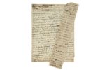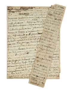 RESTIF DE LA BRETONNE Nicolas Edme (1734 - 1806) MANUSCRIT autographe, Vie voluptueuse. Les 6 maitresses simultanées ; 4 pages in-4 d'un bifeuillet (pag. 211 - 214) et un petit feuillet (24 x 5 cm) portant au dos l'adresse du Cen Retif, Rue de la Bucherie N° 9.. Rare fragment d'un conte libertin. Récit d'un homme devenu riche, et qui paie «les élèves d'une célèbre couturière» pour leurs faveurs. Le narrateur souhaite «faire le bien-être de toutes ces Fillettes» : Petiteblanche, Gerardette, Doucette, Poulette, Rubanrose... Il profite particulièrement de la soumission de Marte-Victoire. Trop pauvre pour refuser à cet homme de tels plaisirs, la jeune fille, âgée de seize ans, se laisse faire : «Vous savez ce que j'ai fait, quand vous m'avés pris la gorge, que vous avés cherché sous mes jupes, que vous m'avés demandé des baisers sur la bouche ? J'ai tout donné, ou laissé prendre ; parce que je ne voulais pas vous priver de votre plaisir». Elle devient alors pour lui un objet «necessaire, pour satisfaire aux besoins physiques. Elle était caressante à volonté, n'apportait d'obstacles à auqu'une fantaisie»... Le narrateur assiste aux ébats de Marte avec son jeune frère libertin : «le jeune homme la renversa, & la posseda, sans qu'elle fit la moindre resistance. Je me gardai bien de les interrompre ! ne voulant causer de saisissement ni à l'une, ni à l'autre»... Leur père intervient, furieux, et s'exclame : «Et si Mr Dulis avait vu cela !» [Dulis est un des pseudonymes favoris de Restif]. Sur le petit fragment, apparaît Dulis : «Blanche fit asseoir Sofie sur ses genoux. Elle ordonna, en riant, à la jolie enfant, de le caresser... de lui donner des baisers voluptueux... de se laisser baiser un beau sein naissant, qu'elle decouvrit à moitié... Sofie obéïssait timidement ; mais son inclinaison perçait au travers de sa retenue. Blanche exigea des protestations d'attachement ?... Sofie les fesait, avec une modestie ravissante»... (La fin manque).